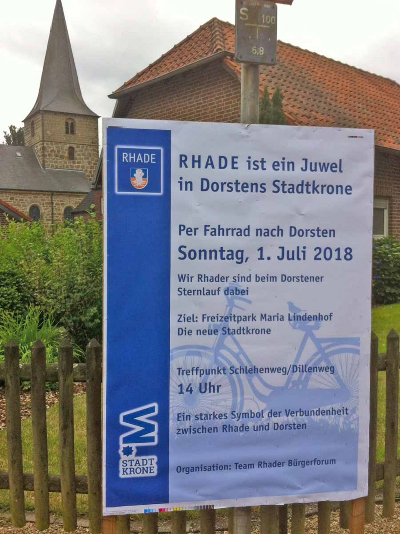 Auf dem letzten Rhader Bürgerforum wurde angeregt, Rhade mit Dorsten symbolisch zu verbinden, um die Einheit unserer Stadt zu stärken. Dass Rhade ein Juwel in Dorstens Stadtkrone ist, soll mit der Teilnahme am sogenannten Sternlauf am 1. Juli nachhaltig und unübersehbar dokumentiert werden. Große Plakate, siehe Foto, werben inzwischen in Rhade zum Mitmachen.