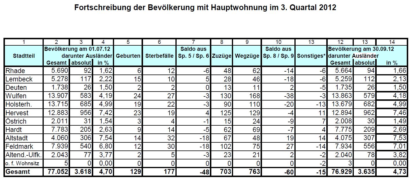 Die Stadt Dorsten hat die Bevölkerungszahlen für das Quartal 3 veröffentlicht.