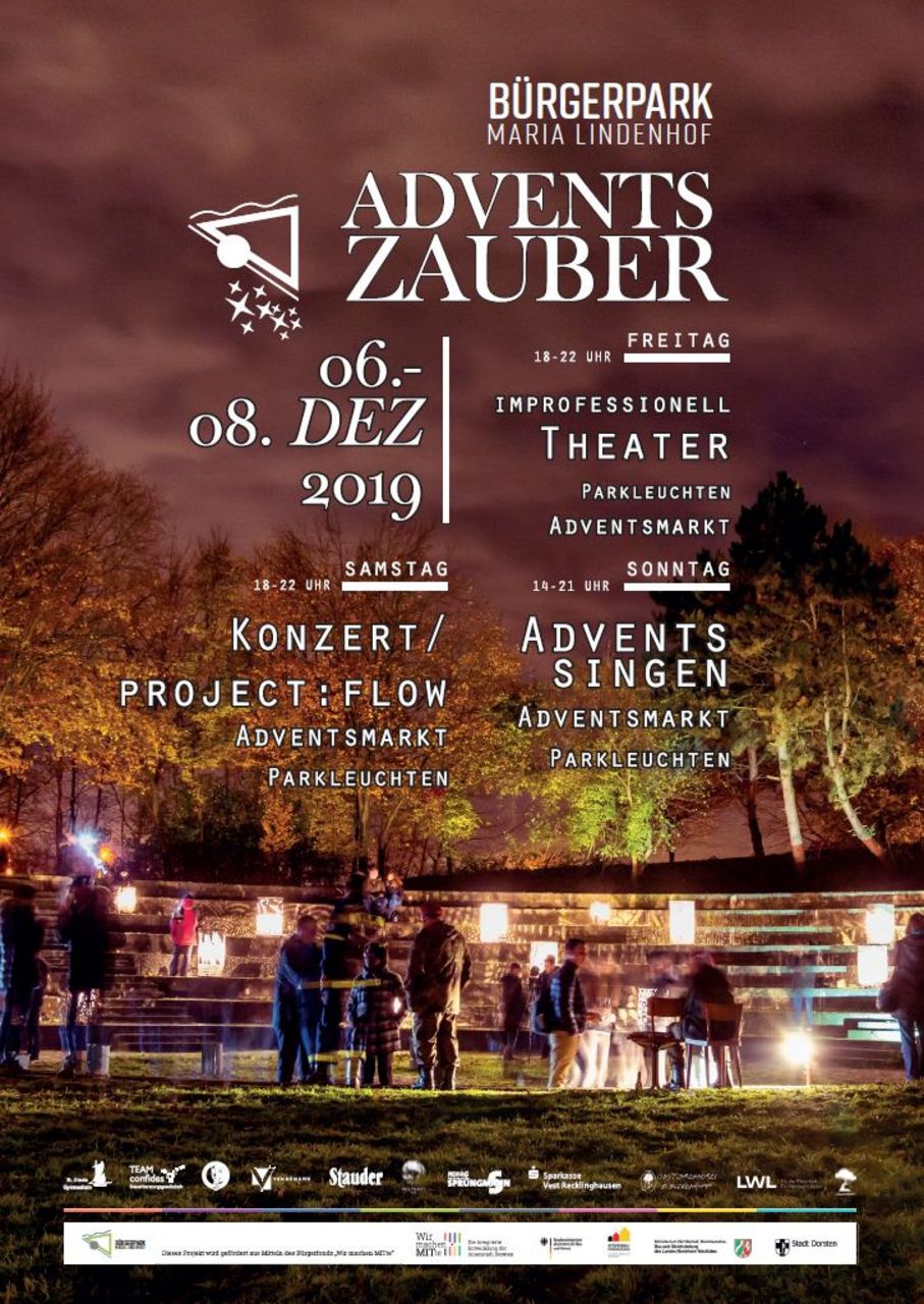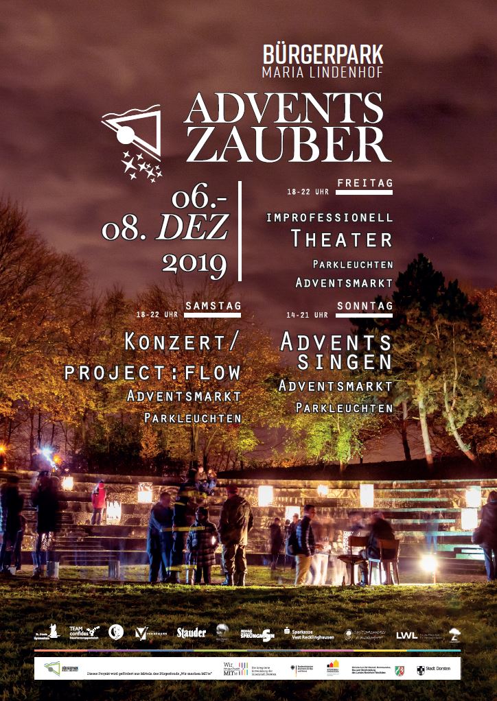 Der neu gegründete Bürgerpark Maria Lindenhof e.V. möchte mit seinem individuellen Zauber in der Adventszeit das Jahr final beschließen und einen Vorgeschmack auf das Jahr 2020 geben. Aus diesem Grund lädt der Verein alle Bürgerinnen und Bürger zum „Adventszauber im Bürgerpark“ zwischen dem 06.-08.12.2019 ein. Der Park wird rund um das Amphitheater mit seiner geöffneten Terrassenbar in vorweihnachtliche Stimmung versetzt. Die Besucher werden ein kulturelles und dem Brauchtum verbundenes Programm sowie eine unvergleichliche Lichtillumination erleben!