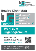 Die Wahlen finden dann im Zeitraum vom 28. Februar bis zum 4. März 2022 statt. Wahlberechtigt sind alle Kinder und Jugendlichen, die in Dorsten leben, ab dem vollendeten 13. Lebensjahr bis zum vollendeten 20. Lebensjahr.