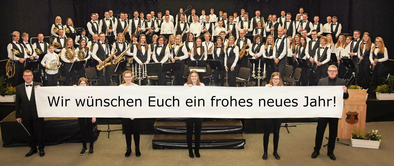 Nach einer kurzen Umbaupause war es dann auch für das Hauptorchester soweit. Mit dem Eröffnungsstück "Where eagles soar" begannen die Musiker unter der Leitung von Christoph Weigel ihr diesjähriges Konzertprogramm. Ein besonderes, wie Moderatorin Claudia Soggeberg erklärte, denn es war ein "10-Jahre Best of Neujahrskonzert". Die beliebtesten Titel der Musiker aus den vergangenen 10 Auflagen des Konzertes standen in diesem Jahr auf dem Programm. Weiter ging es mit dem Konzertmarsch "Arsenal" und mit einer Fahrt in der Eisenbahn durch den Wilden Westen mit Oregon. Der "Abschied der Slawinen" stand als nächstes auf dem Programm, aber sollte kein Abschied für die Musiker werden, sondern es folgte die beliebteste Polka der Musiker "Von Freund zu Freund". Weiter ging es dann mit Musical-Medley "Phantom der Oper" und im Anschluss daran zeigte uns Ingo Hinzmann wie man Frank Sinatras Welthit "My Way" auf der Posaune interpretiert, was das Publikum mit lautem, langanhaltenden Applaus zu würdigen wusste. Im Anschluss daran, ging es mit dem Piratenschiff auf die stürmische See mit den Filmhit "Pirates of the Caribbean" aus dem Film Fluch der Karibik. "I dreamed a Dream" stand als nächstes im Programmheft und zeigte mit einer beeindruckenden Gesangsdarbietung von Alina Baukholt, dass die Schützenkapelle Rhade auch ohne Instrumente zu begeistern weiß. Mit einem Medley von Herbert Grönemeyers größten Hits stand dann ein Stück aus dem Bereich Rock & Pop auf dem Programm. Zum Abschluss gab es dann aber doch noch ein Stück, was noch nie auf dem Neujahrskonzert gespielt wurde. Mit "All you need is Love" verabschiedeten sich die Musiker von einem tollen Publikum, welches die Musiker aber mit Standing Ovations und Zugabe-, Zugabe-Rufen nicht so ohne weiteres von der Bühne ließ. So reihten sich nun die Musiker des Jugendorchesters dazu und gemeinsam wurde wie es für ein Neujahrskonzert üblich ist, der traditionelle "Radetzky-Marsch" gespielt. Das Publikum ließ die Musiker aber immer noch nicht von der Bühne und so gab es mit "Auld Lang Syne" ein letztes Highlight des diesjährigen Konzertes, was auch noch einmal von Gospelchor Enjoy! gesanglich unterstützt wurde.