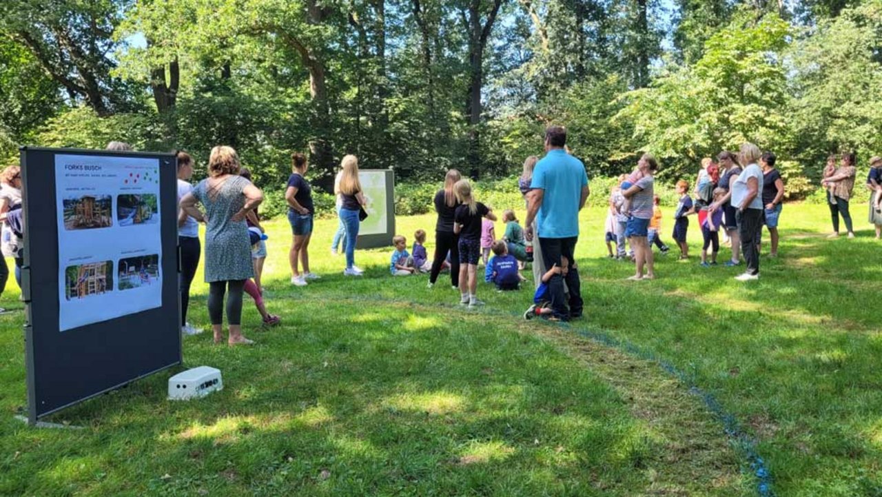Vor der Umgestaltung des Forks Busch in Rhade teilen Kinder u.a. mit, welche Spielgeräte sie sich wünschen. Mehr als 60 Bürger_innen folgen der Einladung der Stadt Dorsten.