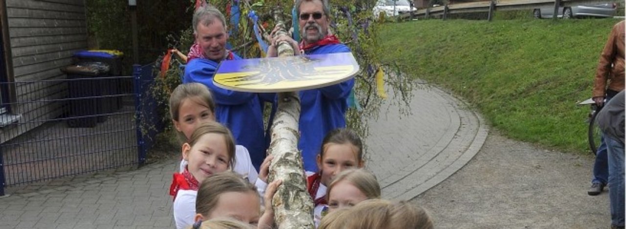 Holzstühle und Notenständer sind aufgebaut, eine von vielen Trompeten wird eingestimmt. Noch klingt sie ein wenig, wie die Hupe eines Schiffes. Alle warten. Ein wenig unbeachtet liegt eine 13 Meter lange Birke auf dem Boden vor einem weiß-grünen Zelt. Mit der Zeit kommen immer mehr Menschen, darunter Mädchen mit Zöpfen, weißen Blusen, blauen Röcken und Strumpfhosen. Sie gehören zur Kindertanzgruppe des Heimatvereins.