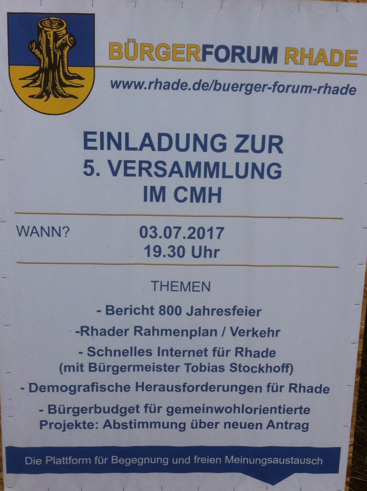 Montag, 3.Juli, 19.30 Uhr, Carola Martius-Haus. Wilhelm Loick, Sprecher des Rhader Bürgerforums wird sicherlich wieder viele Bürgerinnen und Bürger begrüßen können. Die grandiose 800 Jahr-Feier ist gerade vorbei, die übrigens auch von Rhadern für Rhader geplant und durchgeführt wurde, da besteht die Möglichkeit über weitere Schwerpunktthemen miteinander zu diskutieren. Schlagworte wie Industrie 4.0 und Digitalisierung machen seit langem die Runde. Voraussetzung, um an der technologischen Entwicklung teilzunehmen, ist aber auch das „schnelle Internet“ vor Ort. Und genau hier gibt es Fragen. Die sollen, nach einem Eingangsstatement der Verwaltung (Bürgermeister) gemeinsam diskutiert werden.