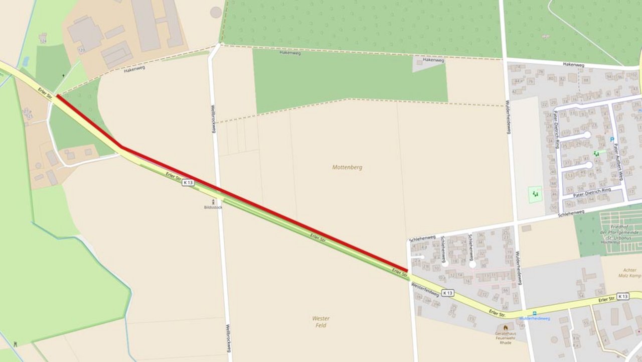 An der Erler Straße (K13) in Dorsten Rhade wird zwischen dem Schlehenweg und dem Hakenweg der Fuß- und Radweg erneuert. Die Arbeiten beginnen am Montag, 12. Juni, und werden voraussichtlich vier Wochen dauern. Im Anschluss bekommt die gesamte Straße zwischen dem Höfer Weg (K7) und dem Rhader Bach eine neue Fahrbahndecke.