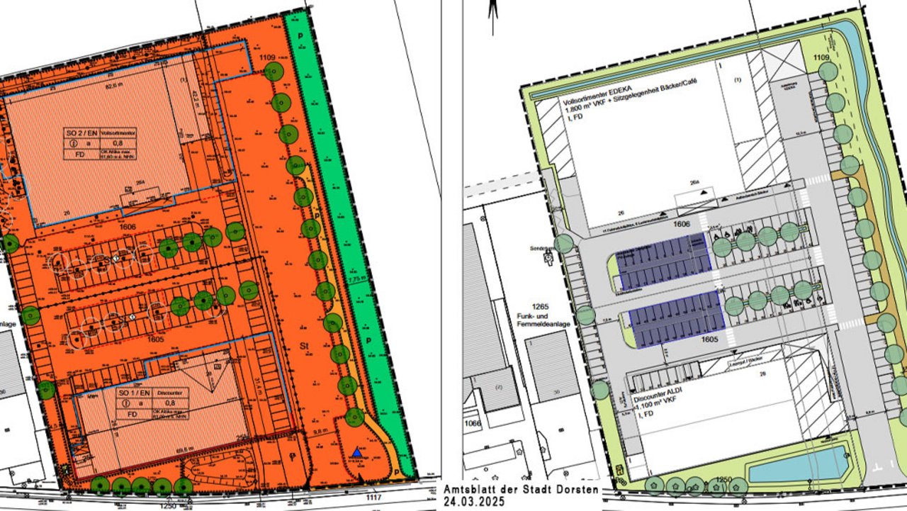 Konkret soll die Verkaufsfläche des Aldi-Marktes von derzeit 751 auf maximal 1.100 Quadratmeter erweitert werden. Der Edeka-Markt wird von 1.349 auf 1.800 Quadratmeter wachsen. Die Baupläne betreffen das Nahversorgungszentrum im nordwestlichen Stadtgebiet von Dorsten, nördlich der Erler Straße (Kreisstraße 13).