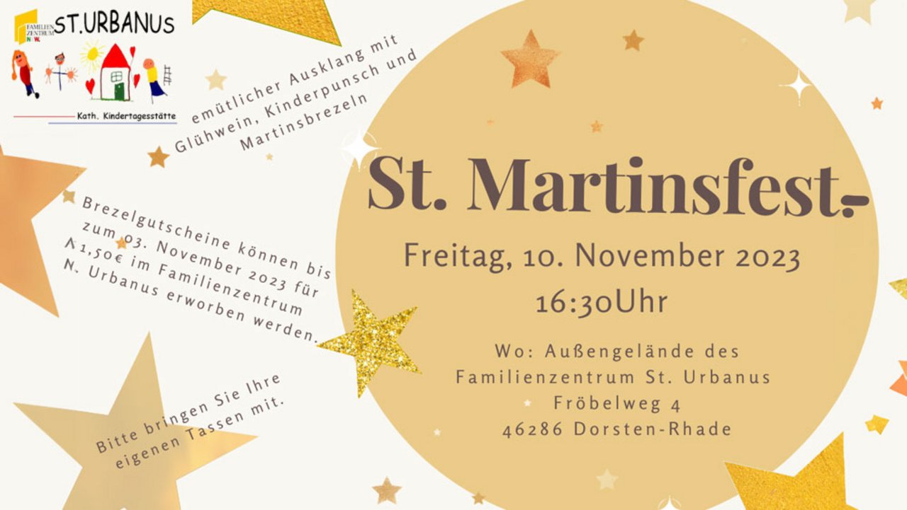Am Freitag, den 10. November 2023 lädt das Familienzentrum St. Urbanus, katholische Kindertagesstätte in Dorsten-Rhade (Fröbelweg 4) alle Rhader Familien zum St. Martinsfest ein.