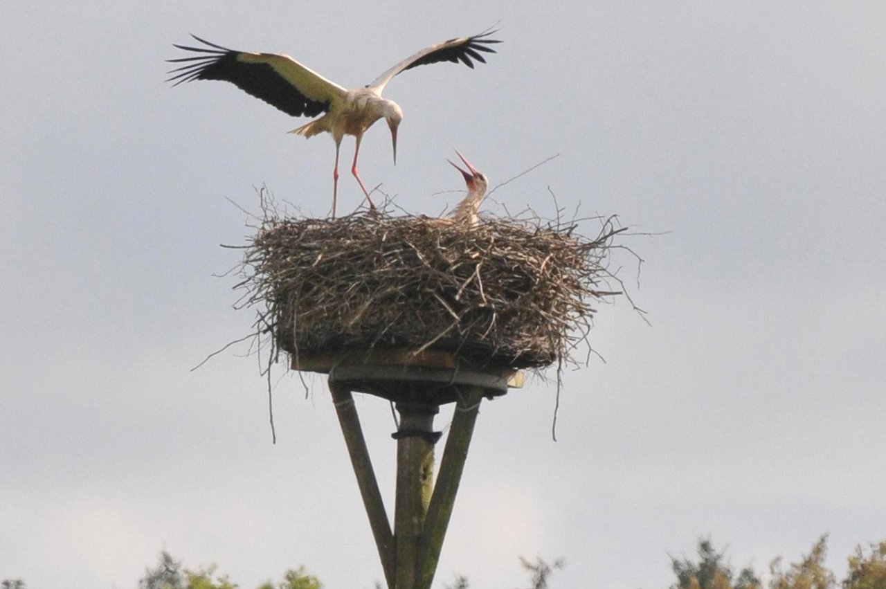 Das Storchenpaar Agnes und Ludger ist jetzt schwer damit beschäftigt, die drei hungrigen Schnäbel zu füttern. Im dritten Jahr in Folge können sich die Eltern über Nachwuchs freuen.
