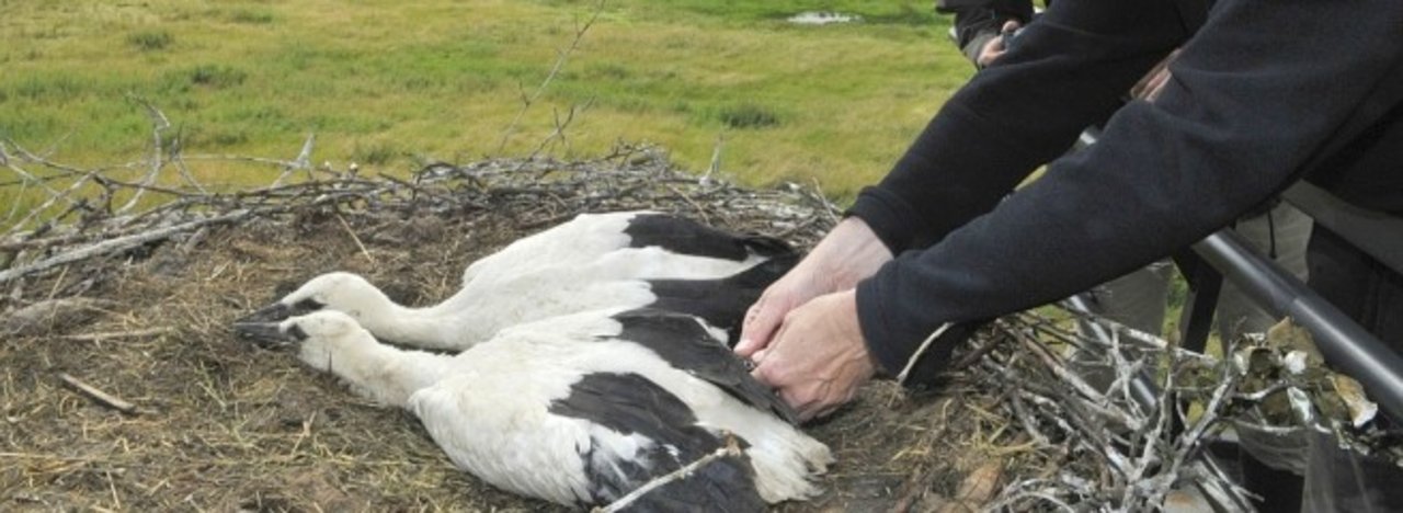 „Es ist schön zu sehen, dass es gelungen ist, die beiden Störche hier ein Habitat zu finden. Der Nachwuchs ist ähnlich wie der in Hervest gesund und macht einen sehr guten Eindruck. Hier wirken sich die Vorteile eines Naturschutzgebietes aus.“, sagt Ornithologe Michael Jöbges, der die Störche beringte.