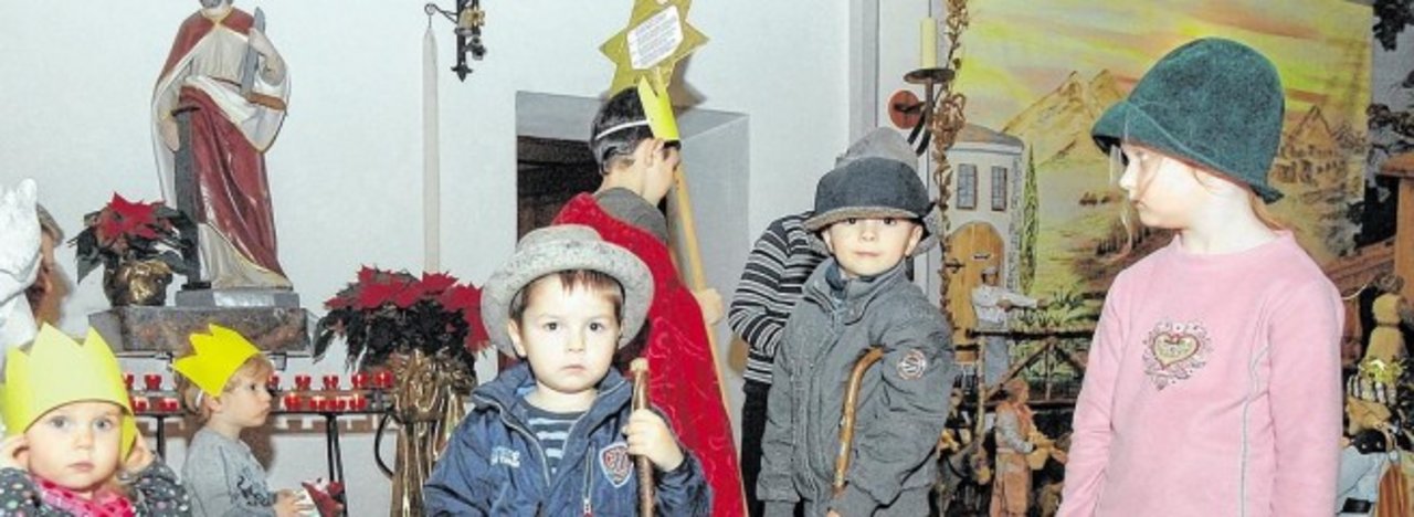 Bunte Kostüme und fröhlicher Gesang vor der Krippe der Rhader Urbanus-Kirche: Auch in seiner vierten Auflage begeisterte das gemeinsame Singen von Weihnachtsliedern rund 50 Rhader Eltern und Kinder.