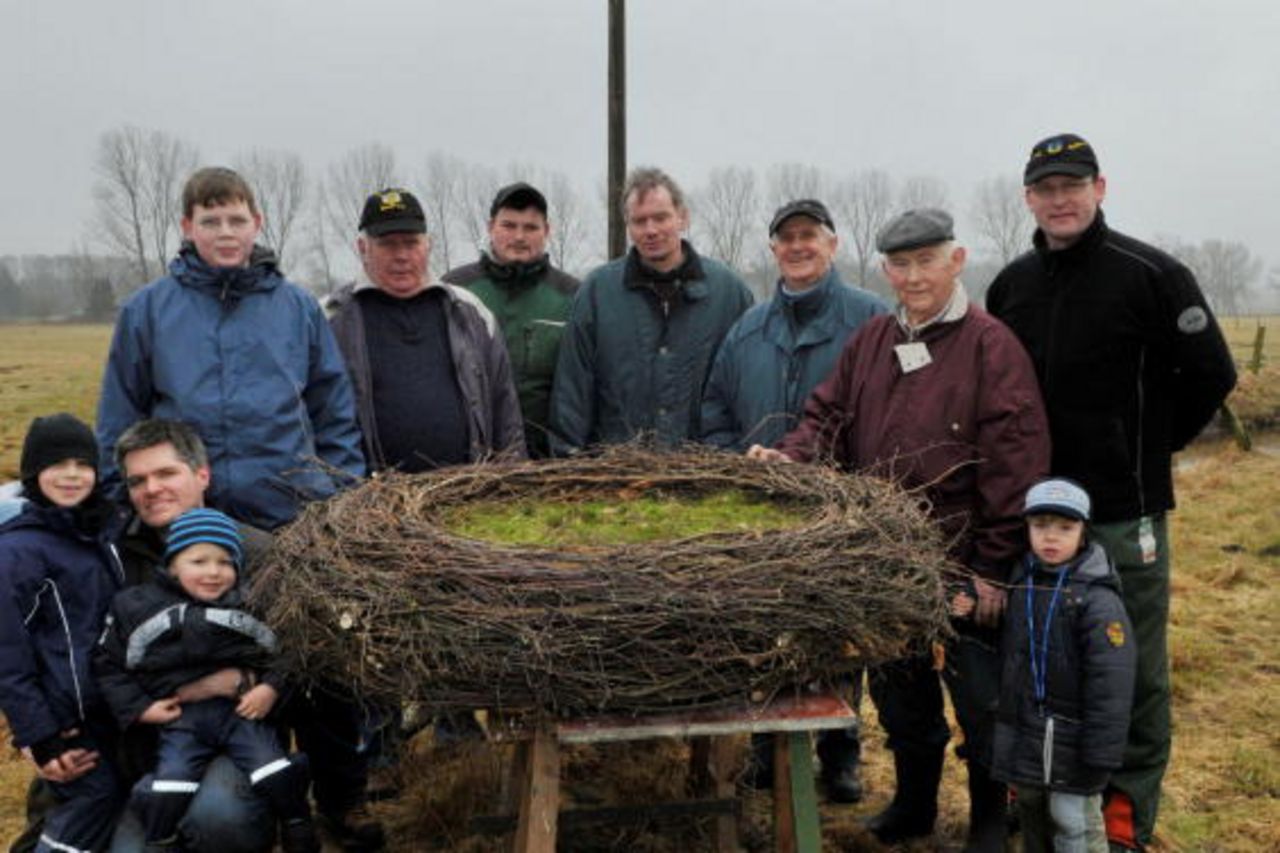 Schon nach den ersten paar Metern versank die Arbeitsmaschine in der Wiese. „Wir mussten den Versuch abbrechen. Es gibt einfach kein Durchkommen. Eigentlich wollten wir noch vor der diesjährigen Brutsaison das Nest fertig stellen, doch das Wetter machte uns einen Strich durch die Rechnung“, so Christoph Höller, der 1. Vorsitzender des Rhader Heimatvereins. Und weiter: „Entweder kommt noch einmal Frost oder wir versuchen es ein zweites Mal bei Trockenheit. Aber die Nisthilfe wird auf jeden Fall aufgebaut, dann halt für die nächste Saison.“ Nach gut einer Stunde packten die Männer wieder ihre Sachen ein und vertagten die Aktion.