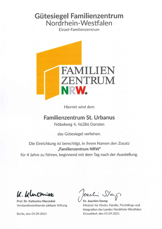 Nach den Sommerferien war die Freude im ganzen Team groß, als man endlich das neue Gütesiegel in den Händen hielt. Das bereits langjährig aktiv arbeitende Familienzentrum St. Urbanus hat das im vierjährigen Rhythmus stattfindende Re-Zertifizierungsverfahren erfolgreich abgeschlossen und wird weiterhin als Knotenpunkt in einem Netzwerk agieren, welches Kinder individuell fördert, Familien umfassend berät und unterstützt und für den Sozialraum Rhade ein verlässlicher Ansprechpartner ist.