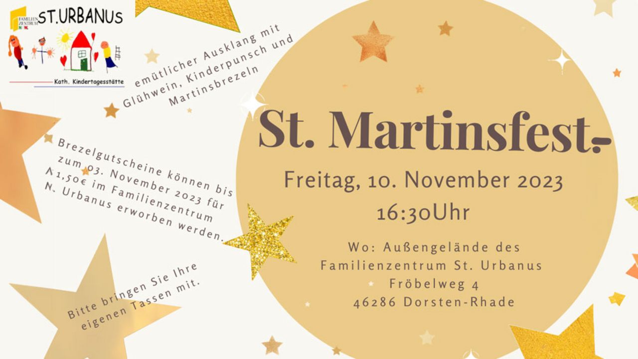 Am Freitag, den 10. November 2023 lädt das Familienzentrum St. Urbanus, katholische Kindertagesstätte in Dorsten-Rhade (Fröbelweg 4) alle Rhader Familien zum St. Martinsfest ein.
