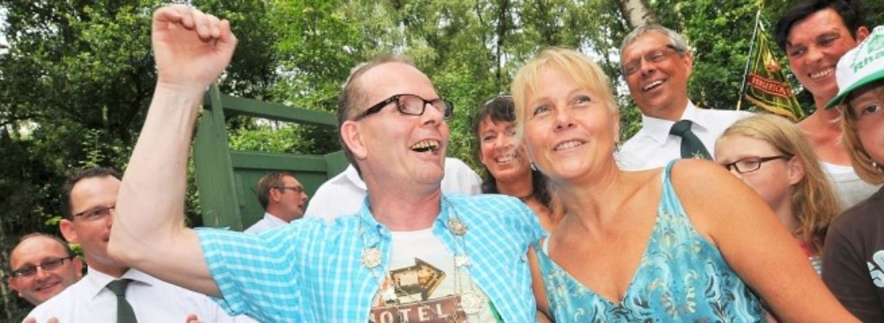 Norbert Bußhoven kommt indes richtig ins Schwitzen, muss sogar sein hellblau-kariertes Hemd ausziehen, steht in Jeans und T-Shirt da. Die Aufschrift: Motel California. Schuss für Schuss schrumpft das hölzerne Vieh. Um 14.19 dann der Gnadenstoß. Norbert Bußhoven ist König von Rhade.