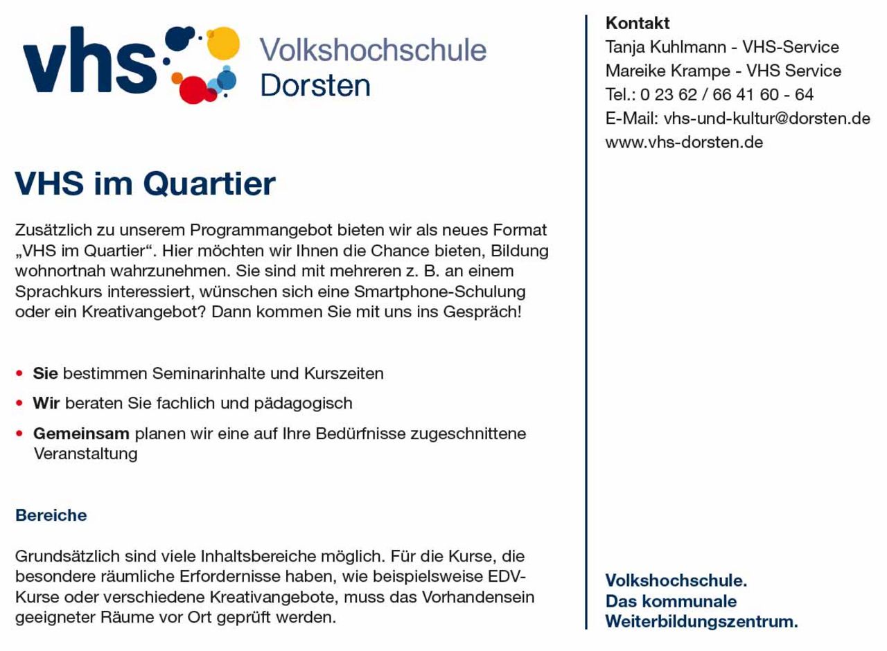 Zusätzlich zu unserem Programmangebot bieten wir als neues Format "VHS im Quartier". Hier möchten wir Ihnen die Chance bieten, Bildung wohnortnah wahrzunehmen. Sie sind mit mehreren z.B. an einem Sprachkurs interessiert, wünschen sich eine Smartphone-Schulung oder ein Kreativangebot? Dann kommen Sie mit uns ins Gespräch!