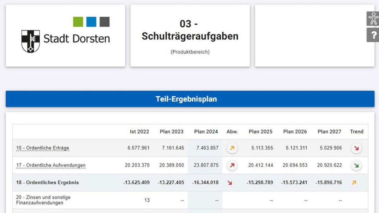 Für welche Aufgabenbereiche gibt die Stadt Dorsten eigentlich wie viel Geld aus? Wer sich bisher mit dieser Frage beschäftigen wollte, der musste in den rund 500 Seiten dicken Haushaltsplan schauen. Im neuen interaktiven Haushalt sind die Eckdaten dieses gewaltigen Zahlenwerks nun für die verschiedenen Fachbereiche übersichtlich, anschaulich und transparent aufbereitet und ganz einfach online verfügbar auf www.dorsten.de/haushalt (dort im Haushaltsjahr 2024).