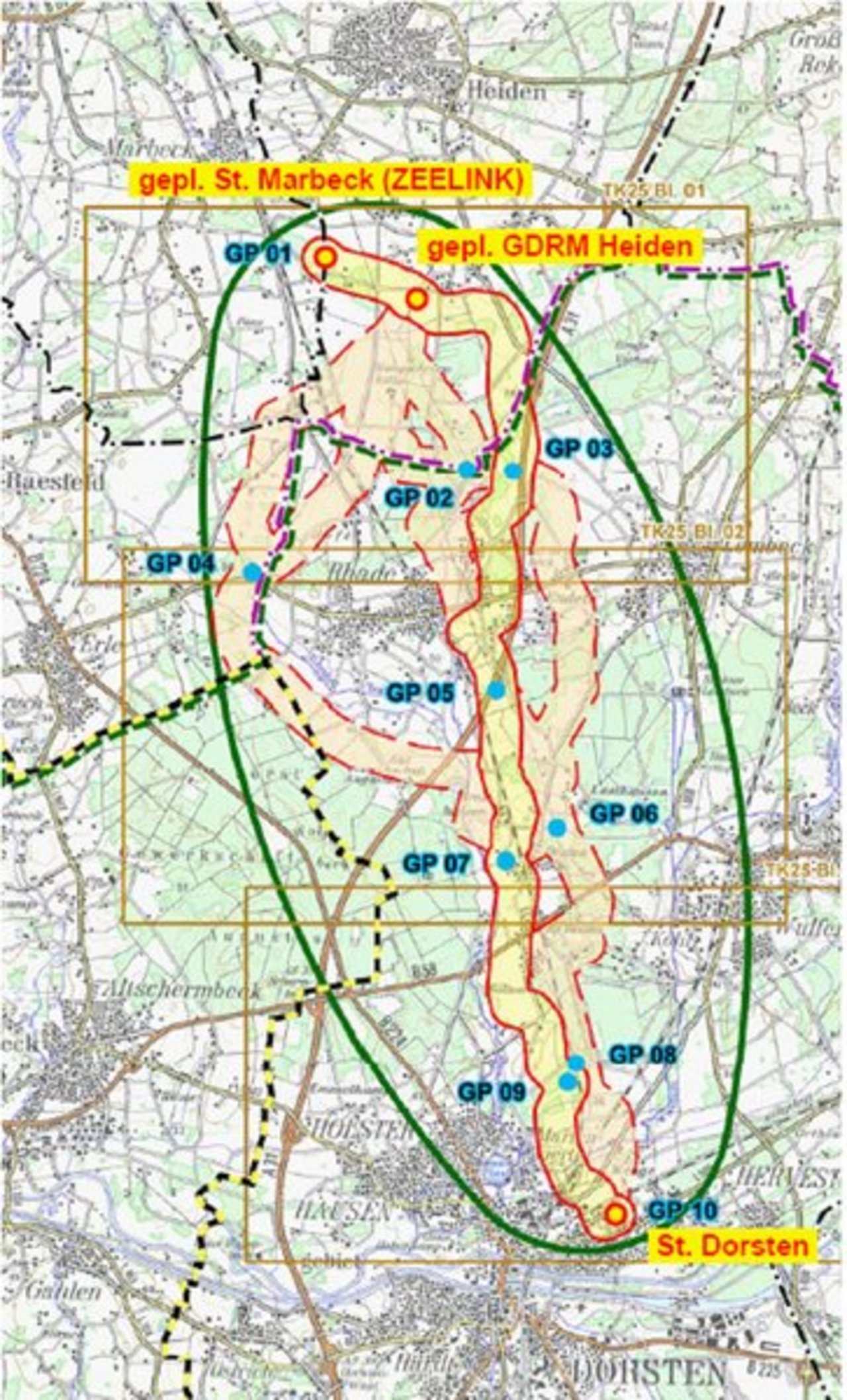 Start der Gaspipeline wäre Heiden. Sie soll dann über Rhade nach Hervest verlaufen. Die Pipeline ist ca. 18,5km lang und hat einen Durchmesser von 0,5m