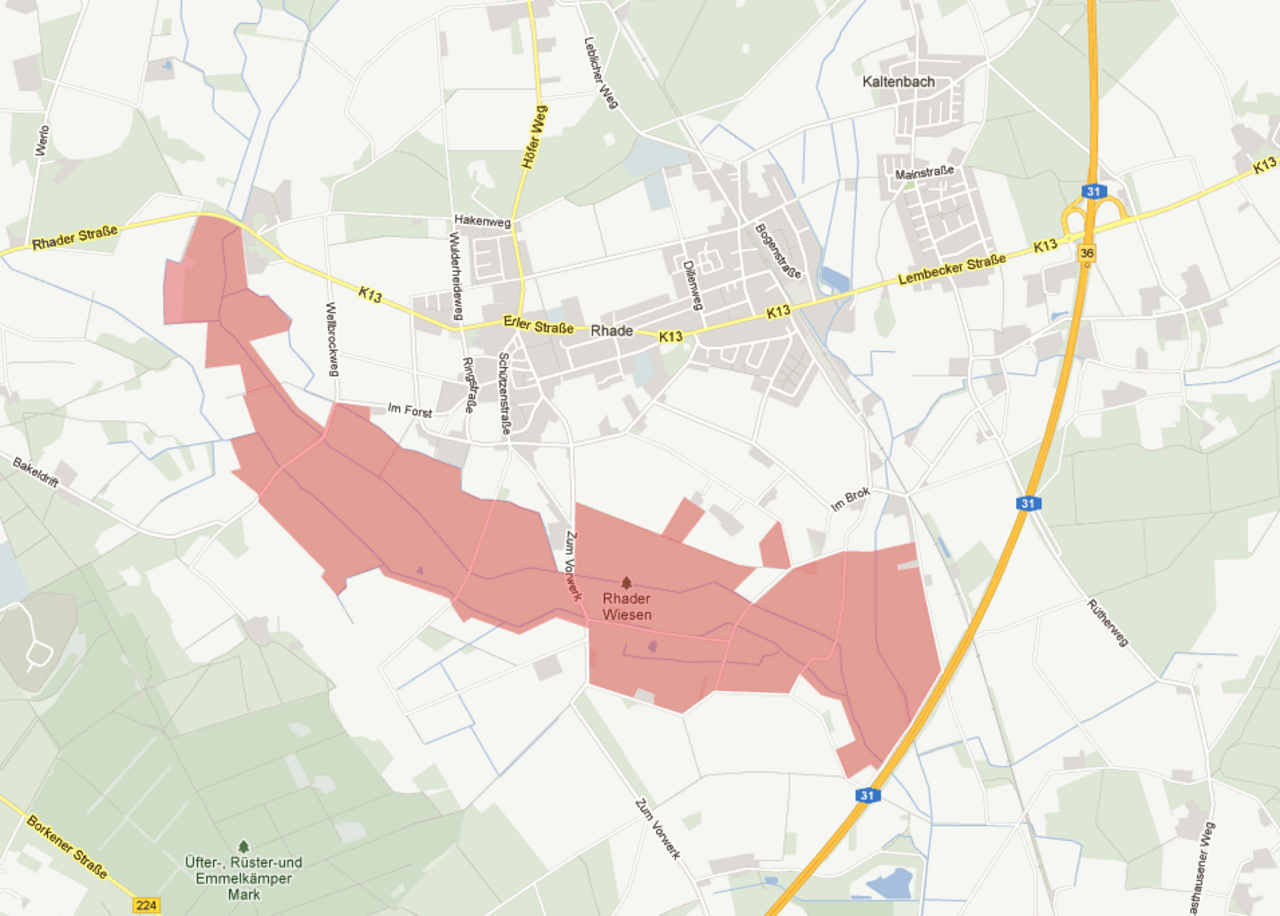 Das Feuchtwiesenschutzgebiet "Rhader Wiesen" RE-001K1 liegt südlich von Rhade außerhalb des FFH-Gebietes (Fauna-Flora-Habitat) exclusive des Rhader Mühlenbaches, der zum FFH-Gebiet DE-4208-301 "Bachsystem des Wienbaches" gehört.